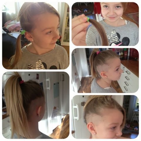 Meja har sen i sommars velat klippa sig. Hon har velat ha ena sidan snaggad. Något som jag ich hennes far ibörjan inte var så förtjusta i. Men efter mer än ett halvårs funderande så har tanken smält in och då hon fortfarande vill ha det så slog vi i dag slag i saken. Jag tog fram min sambos rakaparat och körde. Och gissa om tjejen blev helnöjd?! Uppsatt hår så det syndes ordentligt och sen ut till kompisarna för att visa. Och det blev inte alls tokigt tycker jag. Dock så förundras man över hur fort min lilla prinsessa blev en liten tuffing.